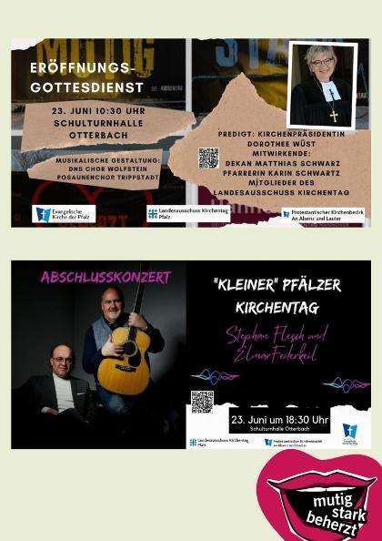 Ein Großereignis mit einem vielfältigen Programm für jedes Alter steht bevor: der Kleine Pfälzer Kirchentag, den die Evangelische Kirche der Pfalz zum ersten Mal am Sonntag, 23. Juni, in Otterbach bei Kaiserslautern veranstaltet. Er steht unter dem Motto „mutig – stark – beherzt“, das dem ersten Korintherbrief, Kapitel 16, Verse 13 und 14 folgt. Ziel ist es, dem Deutschen Evangelischen Kirchentag, der alle zwei Jahre und im kommenden in Hannover stattfindet, in den Jahren dazwischen einen kleinen Bruder zur Seite zu stellen, um ihn im Bewusstsein der Menschen zu halten. Und dennoch wird es in der Westpfalz eine Großveranstaltung mit viel Musik, Podiumsdiskussionen, Workshops, Vorträgen, Gottesdiensten, Spiel und Spaß geben, zieht sich die Feiermeile doch von der Protestantischen Christuskirche und Goetheschule über die Gartenstraße und Promenade im Ottertal bis hin zur Katholischen Kirche Mariä Himmelfahrt.