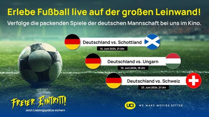 In ausgewählten UCI Kinos können Fußballfans die Europameisterschaft live erleben und zunächst die Spiele der deutschen Mannschaft in der Gruppenphase ab dem 14. Juni verfolgen. Die Spiele werden kostenfrei auf der großen Kinoleinwand live übertragen und können mit bester Sicht von allen Plätzen in entspannter Atmosphäre gemeinsam mit Freunden und Familie genossen werden. Besonders für Familien bietet der Kinosaal eine wetterfeste und entspannte Alternative im komfortablen Kinosessel. Verpflegung mit Nachos, Popcorn und Erfrischungsgetränken gibt es an den Erfrischungstheken.