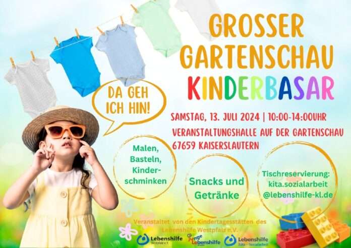 Pünktlich zum Ferienstart veranstalten die vier integrativen Kindertagesstätten des Lebenshilfe Westpfalz e.V. am 13.07. zum ersten Mal den Großen Gartenschau-Kinderbasar. Von 10:00-14:00 Uhr wird die Veranstaltungshalle der Gartenschau in eine große Basarhalle verwandelt. Eltern haben die Möglichkeit ihre schon gebrauchten Baby- und Kinderkleider, Spielsachen, Kindermöbel u.v.m. zu einem guten Preis zu verkaufen. Kinder dürfen auf Teppichen ihre eigenen Verkaufskünste zeigen.