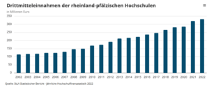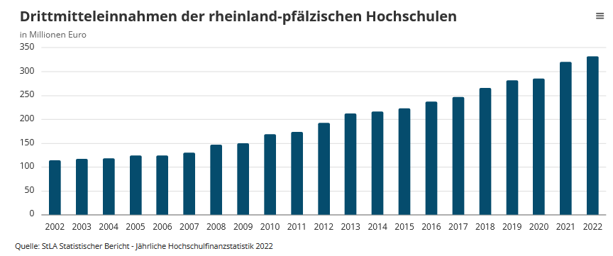 Die Hochschulen in Rheinland-Pfalz nahmen im Jahr 2022 insgesamt 333 Millionen Euro an Drittmitteln ein. Nach Angaben des Statistischen Landesamtes waren das knapp zwölf Millionen Euro mehr als im Vorjahr (plus 3,7 Prozent).