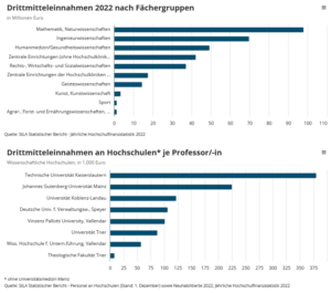 Die Johannes-Gutenberg-Universität Mainz warb mit gut 100,5 Millionen Euro die meisten Drittmittel unter den wissenschaftlichen Hochschulen ein; das waren 1,3 Prozent mehr als im Vorjahr. Die zweithöchsten Einnahmen verbuchte die Technische Universität Kaiserslautern mit 79,5 Millionen Euro (plus 19,6 Prozent), die dritthöchsten die Universitätsmedizin Mainz mit 65,6 Millionen Euro (minus 16,2 Prozent). Zusammen vereinnahmten die wissenschaftlichen Hochschulen in Rheinland-Pfalz knapp 288 Millionen Euro (plus 1,7 Prozent).