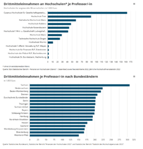 Bei den Hochschulen für angewandte Wissenschaften belegte die Cusanus Hochschule für Gesellschaftsgestaltung mit rund 162.600 Euro je Professorin bzw. Professor den ersten Platz (plus 26,4 Prozent), gefolgt von der Hochschule Trier mit 88.800 Euro (plus 41,1 Prozent). Die Hochschulen für angewandte Wissenschaften kamen in Rheinland-Pfalz zusammen auf einen Durchschnitt von 47.000 Euro je Professorin bzw. Professor (plus 16,6 Prozent).