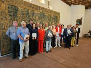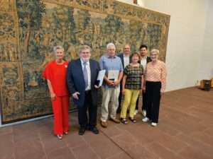 BU Barbarossasiegel: OB Beate Kimmel mit den Trägerinnen und Trägern des Ältesten Stadtsiegels und des Barbarossasiegels (v.l.)Jörg Walter, Fritz Henrich, Gabriele Wollenweber und Eva Lenz. Im Hintergrund Bürgermeister Manfred Schulz und Beigeordneter Manuel Steinbrenner.