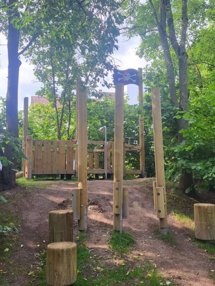 Vergangene Woche hat die Kita Regenbogen ein weiteres, neues Spielgerät in ihrem Außengelände eingeweiht, welches sie gemeinsam mit der benachbarten Kita in der Mannheimer Straße nutzt. Die auf einem kleinen Hügel stehende Holzinstallation stellt ein Piratenschiff dar, das von den anwesenden Kindern liebevoll „Klabautermann“ getauft wurde.