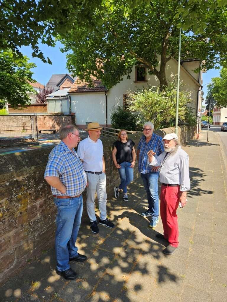 Gut fünf Stunden dauerte die Tour bei strahlendem Sonnenschein, die in dem unter Denkmalschutz stehenden Rathaus in der Ortsmitte begann, Dort befindet sich nicht nur der schöne alte Ratssaal, sondern auch die Stadtteilbibliothek, die auch gerade geöffnet hatte, als Schulz vorbeischaute. Nach einem kurzen Hallo in der gut besuchten Vinothek mit ihrem Mini-Obst- und Gemüsestand ging es vorbei am Insektengarten auf der Rückseite der Ortsverwaltung in Richtung des Alten Friedhofs in der Rotenbergstraße. Die lauschige parkähnliche Fläche mit ihren alten Bäumen und dem Friedhofskreuz und dem Kriegerdenkmal – zwei weiteren von insgesamt elf Denkmälern in Erfenbach – wird heute unter anderem als Veranstaltungsort, etwa für Konzerte genutzt.