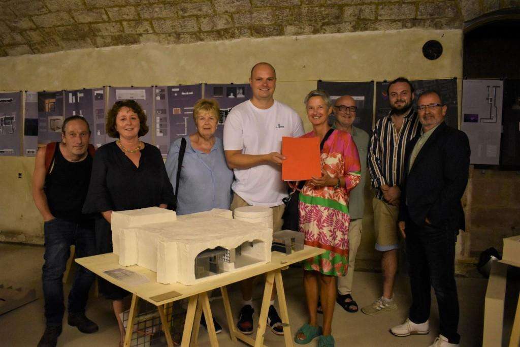 Bildunterschrift: Oberbürgermeisterin Beate Kimmel übergibt Lukas Theisen, erster Vorsitzender des Sukura e.V., (Mitte) und Fridolin Pusch, Schatzmeister des Sukura e.V., (2.v.r.) gemeinsam mit Thomas Kuntz, Geschäftsführer der Bürgerhospitalstiftung, (1.v.r.) und Mitgliedern des Hospitalausschusses den Bewilligungsbescheid. Im Vordergrund ist eines der Modelle des geplanten soziokulturellen Zentrums, die von Studentinnen und Studenten der Hochschule Kaiserslautern entworfen wurden.