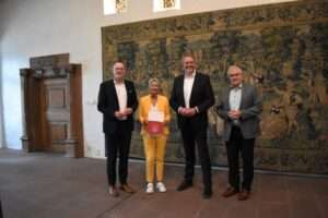 BU 240819_Förderbescheidübergabe_Pfalztheater: V.l.: Innenminister Michael Ebling, Oberbürgermeisterin Beate Kimmel, Ministerpräsident Alexander Schweitzer und Bezirkstagsvorsitzender Theo Wieder bei der Übergabe des Förderbescheids für das Pfalztheater im Pfalzgrafensaal.