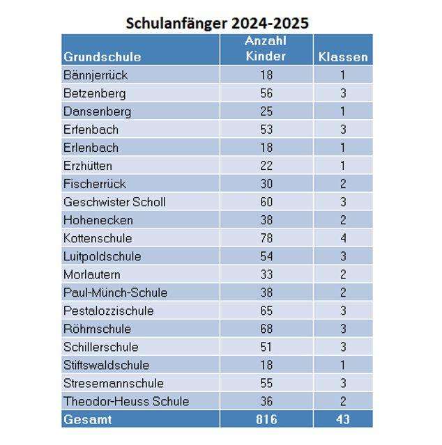 Die Schulen mit der größten Zuwachsrate gegenüber dem Vorjahr sind die Stresemannschule (+ 16), gefolgt von der Betzenberg-Grundschule (+ 14) und der Schillerschule (+ 12) in jeweils drei statt bisher zwei Klassen. Die wenigsten Kinder werden in der Bännjerrückschule eingeschult (18). Sie ist eine von fünf Schulen, an denen nur eine erste Klasse gebildet wird.