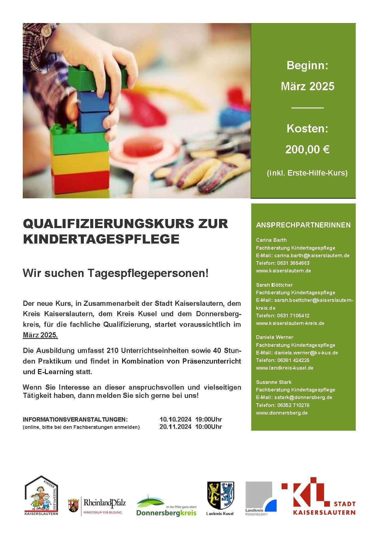 Wer Lust auf neue Erfahrungen hat und sich vorstellen kann, als Kindertagespflegeperson zu arbeiten, hat 2025 erneut die Gelegenheit, sich zu qualifizieren. Die Stadt Kaiserslautern, der Landkreis Kaiserslautern, der Landkreis Kusel und der Donnersbergkreis bieten einen gemeinsamen Qualifizierungskurs an, der voraussichtlich im März 2025 beginnt. Die Ausbildung umfasst 210 Unterrichtseinheiten sowie 40 Stunden Praktikum und findet in Kombination von Präsenzunterricht und E-Learning statt. Die Kosten belaufen sich auf 200 Euro (Erste-Hilfe-Kurs inklusive).