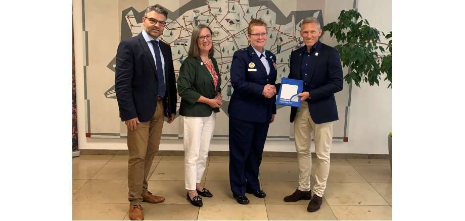 Am 22. August kam Brigadegeneral Adrienne L. Williams in Begleitung von Roberto da Costa, Leiter Verbindungsbüro Flugplatz Ramstein, zu einem Antrittsbesuch in die Kreisverwaltung. Landrat Ralf Leßmeister und die Erste Kreisbeigeordnete Gudrun Heß-Schmidt begrüßten die neue Kommandeurin des 86. Lufttransportgeschwaders der Ramstein Air Base. Gleich zu Beginn des Gesprächs überraschte Brigadegeneral Williams die Gastgeber mit der Mitteilung, dass sie den Landkreis bereits in ihrer Kindheit, als ihr Vater auf der Militärbasis in Sembach stationiert war, kennen und lieben gelernt habe. Sie freue sich, nun im Rahmen ihrer eigenen Karriere, wieder hier in der Region zu sein. Sie unterstütze es, dass seitens der Militärgemeinde neu angekommene Militärangehörige mit einer ausführlichen Bustour den Landkreis kennenlernen können. Dabei vermittle man auch relevante Informationen für den Alltag am neuen Standort. Landrat Leßmeister betonte, wie wichtig es sei, in diesem Zusammenhang auch die Basics zur Mülltrennung zu vermitteln. Alle Bewohnerinnen und Bewohner des Landkreises könnten in diesem relevanten Bereich durch richtige Mülltrennung ihren Beitrag zur Kostenminimierung leisten.