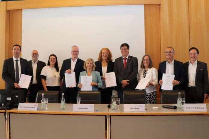 v.l.: Philipp Langefeld (Leiter Infrastrukturprojekte Südwest DB InfraGO AG); Michael Forster (künftiger Oberbürgermeister Stadt Homburg); Cristina Reisenauer (Prokuristin u. Geschäftsbereichsleiterin Fahrgast & Finanzierung VRN GmbH); Dr. Klaus Vornhusen (Konzernbevollmächtigter Deutsche Bahn AG für die Länder Rheinland-Pfalz und Saarland); Ministerin Katrin Eder (Ministerium für Klimaschutz, Umwelt, Energie und Mobilität Rheinland-Pfalz); Ministerin Petra Berg (Ministerium für Umwelt, Klima, Mobilität, Agrar und Verbraucherschutz Saarland); Dr. Marold Wosnitza (Oberbürgermeister Stadt Zweibrücken); Gudrun Heß-Schmidt (Stellvertretende Verbandsvorsitzende Zweckverband Verkehrsverbund Rhein-Neckar); Dr. Fritz Brechtel (Verbandsvorsitzender Zweckverband Öffentlicher Personennahverkehr Rheinland-Pfalz-Süd), Michael Heilmann (Verbandsdirektor Zweckverband Öffentlicher Personennahverkehr Rheinland-Pfalz-Süd)