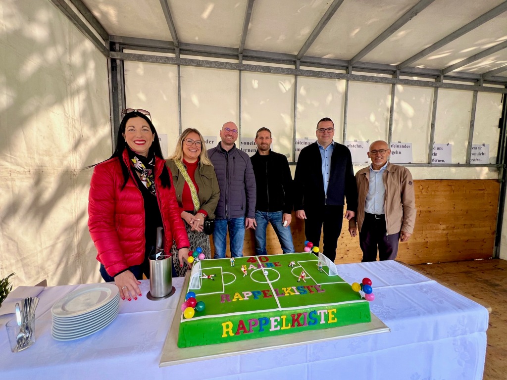 Mit einem großen Begegnungsfest – dem 6. Lautrer Westfest – rund um den Käthe-Kollwitz-Spielplatz in Kaiserslautern feierte die Spiel- und Lernstube Rappelkiste am Sonntag ihren 40. Geburtstag. Als eine der ersten Gratulantinnen hatte Jugenddezernentin Anja Pfeiffer auch ein großes Überraschungsgeschenk im Gepäck. Zur offiziellen Eröffnung des Festes, gemeinsam mit Werner Butz, Einrichtungsleiter der Rappelkiste, brachte Pfeiffer eine riesige Torte in Form eines Fußballfeldes mit – und die stand stellvertretend für das Kleinspielfeld, das dank großzügiger Sponsoren auf dem Gelände der Spiel- und Lernstube gebaut werden soll.