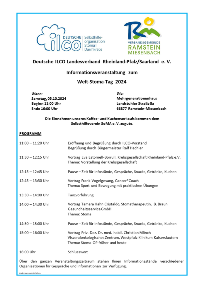 Am 05.10.2024, von 11:00 Uhr bis 16:00 Uhr, findet im Mehrgenerationenhaus, Landstuhler Str. 8a in Ramstein-Miesenbach, eine Informationsveranstaltung des Deutschen ILCO Landesverbandes Rheinland-Pfalz/Saarland e. V. statt. Anlass ist der alle drei Jahr stattfindende Welt-Stoma-Tag. In diesem Jahr steht der Welt-Stoma-Tag im Zeichen der Bewegung. Es soll Mut zur Bewegung machen, denn auch mit einem Stoma (künstliche Darmausgang, oder künstliche Harnausleitung) ist Sport noch möglich. Hierzu wird unter anderen auch ein Physiotherapeut einen Vortrag halten. Ebenfalls wird es einen Vortrag von einem Arzt, einer Stomatherapeutin sowie von der Krebsgesellschaft geben. Das hört sich für Sie interessant an? Dann freuen wir uns über ihr kommen. Bei Fragen wenden Sie sich gerne an die Landesvorsitzende Katrin Knaack unter der E-Mail-Adresse ilco.shg.westpfalz@gmail.com.