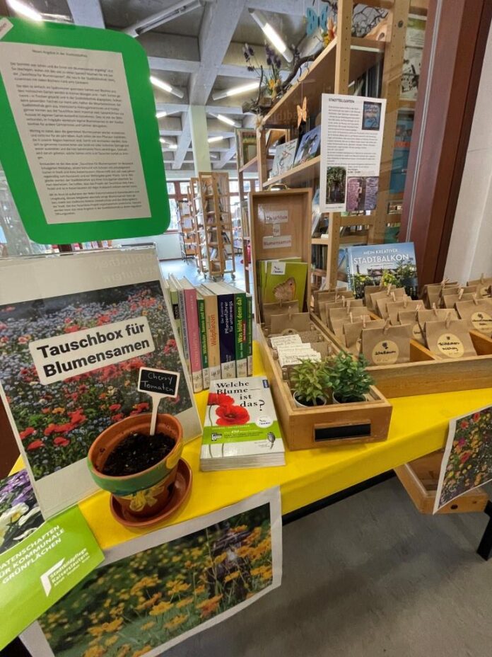 BU: Der Tisch in der Stadtbibiliothek mit Infos rund ums Gärtnern und Blumensamen zum Mitnehmen.