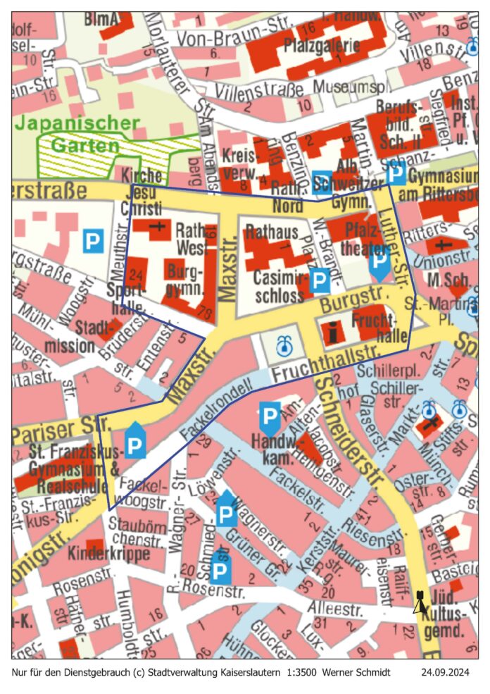 Die Stadt Kaiserslautern hat eine Allgemeinverfügung herausgegeben, wonach der Konsum von Cannabis bis einschließlich 31. Oktober 2025 auf öffentlichen Flächen im Umfeld des Rathauses und des „K in Lautern“ verboten ist. Das Verbot gilt von der Meuthstraße bzw. Humboldtstraße im Westen bis zur Martin-Luther-Straße im Osten sowie von der Lauterstraße/Ludwigstraße im Norden bis zur Fruchthallstraße im Süden (siehe Karte). Es erstreckt sich bei den Straßen im Grenzbereich auf beide Straßenseiten und gilt an Schultagen (Montag bis Freitag außerhalb der offiziellen Schulferien) in der Zeit zwischen 07.00 bis 18.00 Uhr. Die Allgemeinverfügung tritt am Tag nach ihrer Bekanntmachung im städtischen Amtsblatt in Kraft, also am Samstag, 05. Oktober 2024, um 0.00 Uhr. Ab dann muss im Fall der Zuwiderhandlung mit einer Geldbuße in Höhe von bis zu 30.000 Euro gerechnet werden.