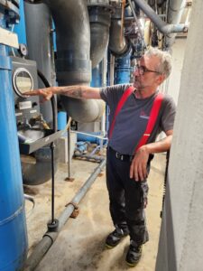 Wobei mit „hinter die Kulissen“ eigentlich der Untergrund des Warmfreibads gemeint ist, denn nahezu die komplette Technik liegt unter dem höhergelegenen Areal des Springerbeckens versteckt. Dort verbergen sich die Mess- und Regelanlagen sowie die Umwälzpumpen und Filter, die für eine einwandfreie Wasserqualität sorgen und die durch Kilometer an Leitungen mit den anderen Becken verbunden sind. „Das Warmfreibad verfügt über einen geschlossenen Wasserkreislauf. Das heißt, das Wasser, das in den Becken überläuft – das sogenannte Schwallwasser – wird gereinigt, desinfiziert und dem Kreislauf als Reinwasser wieder zugeführt“, erklärt Christian Noll, im Rathaus zuständig für Sanitär- und Schwimmbadtechnik.