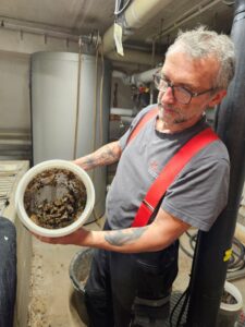 Für die Beckenwasserumwälzung sorgen die neuesten Bauteile im Warmfreibad, eine Reihe hocheffizienter Umwälzpumpen, eingebaut 2023, sehr sparsam und rostfrei, dank einer Sonderbeschichtung. Für die Winterzeit wird die Aufbereitungsanlage dann, mit Ausnahme der Becken, entleert. Komplett entleert werden darf die Pumpenanlage im Winter jedoch nicht, wie Peter Weingart berichtet, vor Ort im Warmfreibad hauptverantwortlich für die Technik. „Ein Rest Wasser muss im Winter in den Pumpen verbleiben um Korrosion sowie ein Verkleben der Dichtungsflächen zu verhindern. Einmal pro Woche werden die Pumpen von Hand gedreht, damit sich nichts festsetzt.“ Weingarts Arbeitsplatz ist unter anderem der große maschinenbestückte Hauptraum im Untergeschoss des Warmfreibads. Hier verrichten die drei Wärmetauscher für das Beckenwasser ihren Dienst, die dafür sorgen, dass das Warmfreibad seinem Namen alle Ehre macht. Die eigentliche Heizung wiederum verbraucht sehr wenig Platz, der komplette Wärmebedarf des Bades wird über Fernwärme gedeckt. Dominiert wird der Technikraum aber von der mächtigen Filteranlage, die aus dem „abgebadeten“ Rohwasser wieder Reinwasser herstellt. Sie besteht aus sechs großen Filterbehältern, jeweils aufgebaut aus fünf Filterschichten unterschiedlicher Korngröße, durch die das Wasser von oben nach unten hindurchströmt. Die oberste Schicht besteht aus Hydroanthrazit, einer Kohleart, die molekulargelöste Verunreinigungen an sich binden kann, anschließend Marmorkies, der die Salzsäure neutralisiert, die sich durch den Einsatz von Chlor als Desinfektionsmittel im Wasser bildet. Insgesamt wälzt die Filteranlage 1065 m³ Wasser pro Stunde um, das ist rund ein Viertel des Gesamtvolumens in den Becken des Warmfreibads von 4000 m³.