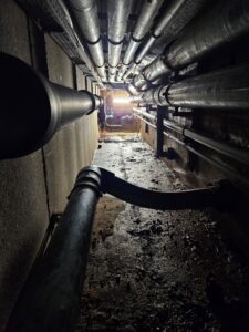 BU Gang: Das Schwimmerbecken ist mit einem Gang, durch den sämtliche Rohre laufen, mit den Technikräumen verbunden. Dieser Gang umläuft das Becken komplett. Wer sich also nicht vor engen Räumen und niedrigen Decken scheut, kann das Schwimmerbecken auf diesem Weg vollständig umrunden. Die dicken Rohre führen das Rohwasser des Schwimmerbeckens zur Aufbereitung und das Reinwasser zurück. Die anderen Rohre beherbergen sämtliche anderen Leitungen und führen u.a. auch ins Haupthaus des Bades mit Trinkwasser, Heizung, Strom, Internet etc..