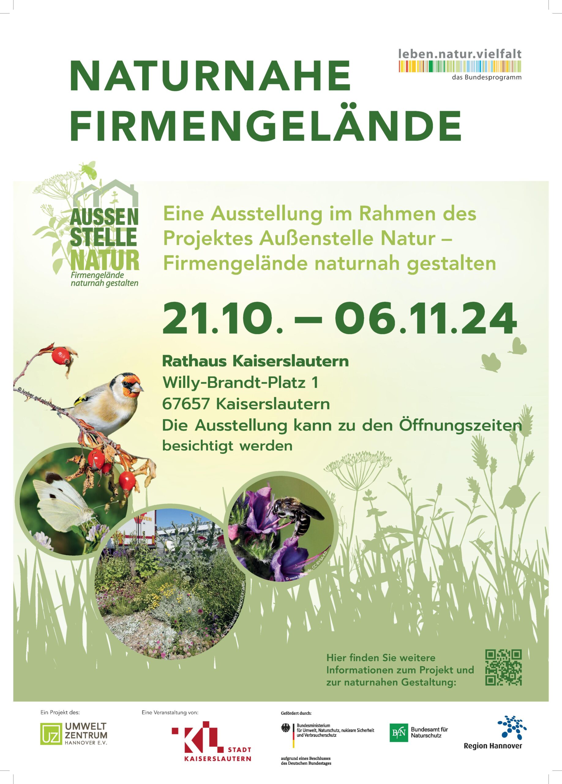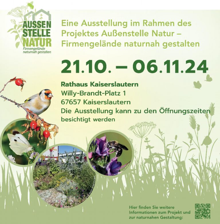 Im Oktober macht die Wanderausstellung „Naturnahe Firmengelände“ des Umweltzetrums Hannover in Kaiserslautern Station. Es werden Beispiele und praktische Möglichkeiten aufgezeigt, wie auch auf den Grün- und Freiflächen von Firmengeländen ein Beitrag zum Erhalt und zur Förderung der biologischen Vielfalt geleistet werden kann.