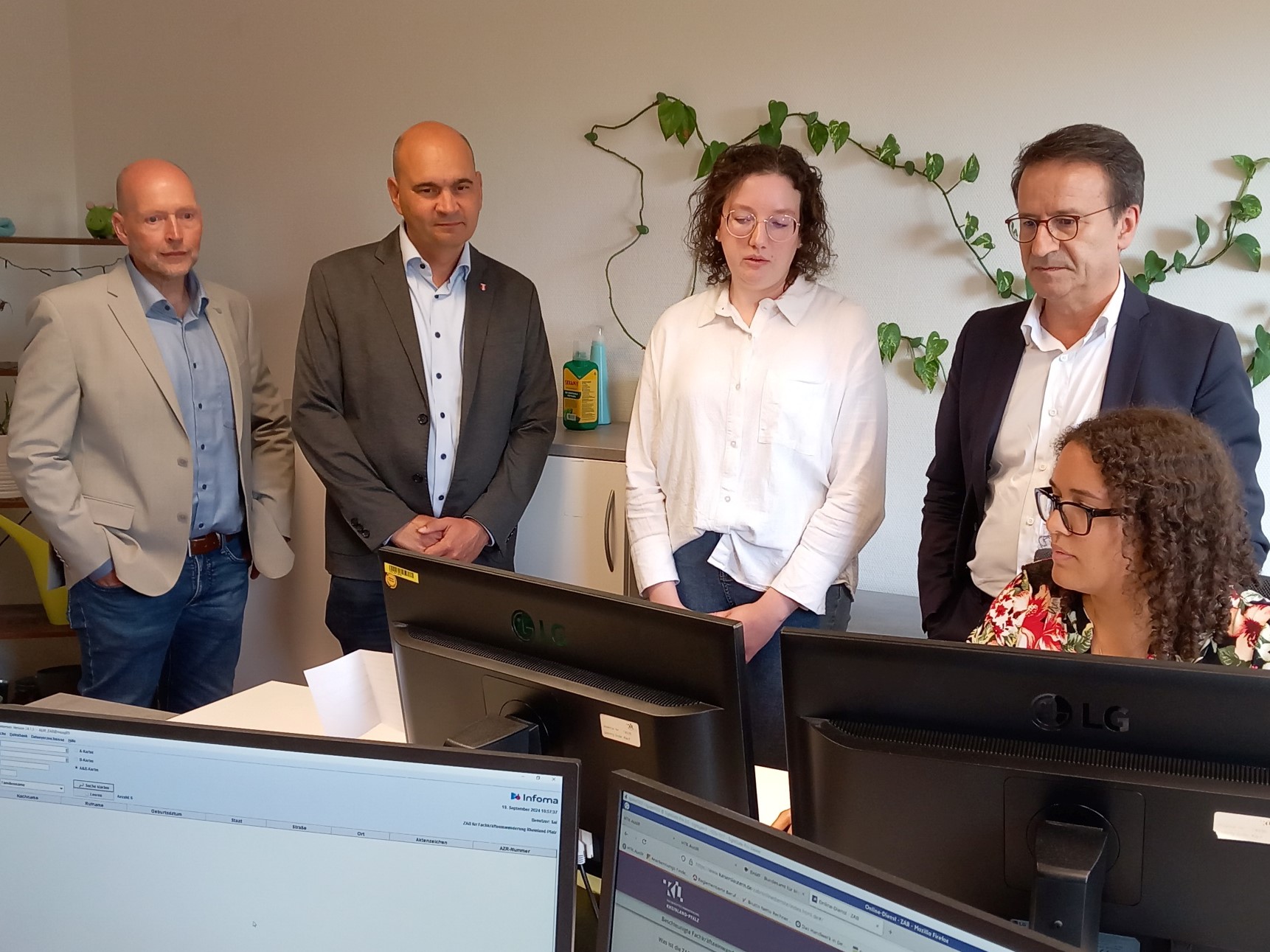 Von der einfachen Handhabung der Benutzeroberfläche bei der Antragstellung sowie dem gut strukturierten und übersichtlichen Bediener-Menü bei der Online-Beantragung konnte sich auch der rheinland-pfälzische Migrations- und Integrationsbeauftragte Vicente bei seinem Besuch überzeugen. „Bei den derzeitigen Entwicklungen am deutschen Arbeitsmarkt und dem stetig steigenden Fachkräftemangel werden wir immer stärker auf eine gewollte Zuwanderung zurückgreifen müssen“, meinte er. Dadurch komme auch der Zentralen Ausländerbehörde bei der Fachkräfteeinwanderung eine immer größere Schlüsselfunktion zu. Bei der abschließenden Diskussion mit dem ZAB-Team äußerte Fachbehördenleiter Adelmann den Wunsch, die Dienstleistung seiner Fachbehörde rund um die erleichterte Fachkräfteeinwanderung im Land noch bekannter zu machen. Diese sei vor allem für kleinere und mittlere Unternehmen geeignet und darüber hinaus relativ kostengünstig. Außerdem tauschten die Gesprächsteilnehmenden verschiedene Erfahrungswerte aus und erläuterten mögliche weitere Entwicklungen rund um die Fachkräfteeinwanderung.