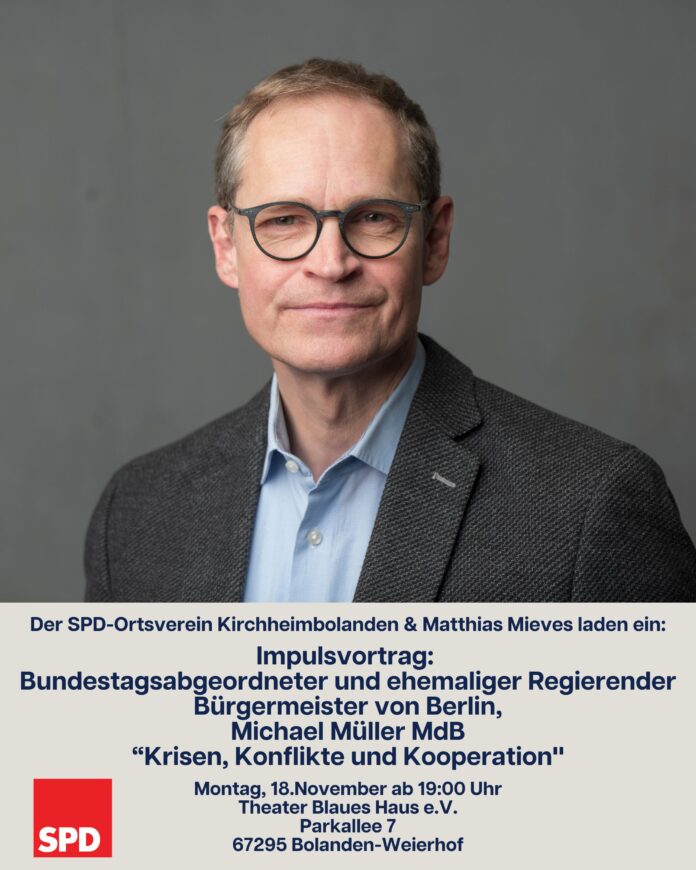 Der SPD-Ortsverein Kirchheimbolanden und der Bundestagsabgeordnete Matthias Mieves (SPD) laden ein: Impulsvortrag im Rahmen der Friedenstage des Bundestagsabgeordneten Michael Müller (SPD), ehemaliger Regierender Bürgermeister von Berlin und Mitglied im Auswärtigen Ausschuss, zum Thema „Krisen, Konflikte und Kooperation“. Die Veranstaltung findet am 18. November 2024 ab 19:00 Uhr im Theater Blaues Haus, Parkallee 7, 67295 Bolanden-Weierhof statt. Wir freuen uns auf Ihr Kommen.