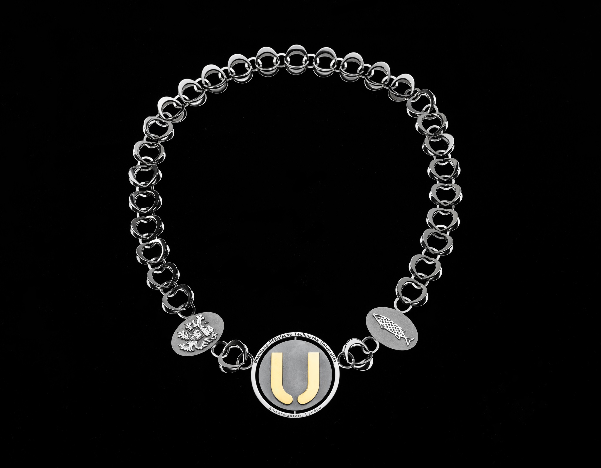 Der neue Präsident der RPTU (Rheinland-Pfälzischen Technischen Universität) Kaiserslautern-Landau, Prof. Dr. Malte Drescher, trägt eine Amtskette, die eine angehende Goldschmiedin der Meisterschule für Handwerker in Kaiserslautern (MHK) gestaltet hat. An 29 Kettengliedern und 32 Zwischenösen aus Sterling-Silber hängt ein U, das sich am Logo der RPTU orientiert; auf der Rückseite sieht man das Wappen von Rheinland-Pfalz. Links und rechts zeigen sich die Wappentiere der beiden Städte: der Fisch für Kaiserlautern und der Löwe für Landau. Das Insigne hat Amelie Hunsicker gestaltet, die ihr zweites Ausbildungsjahr an der MHK absolviert.