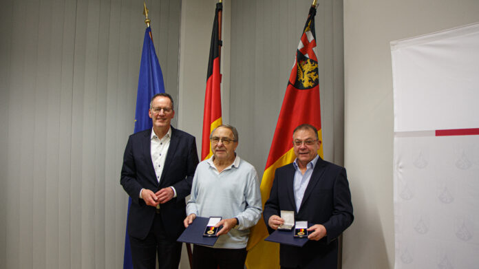Innenminister Michael Ebling hat Frederic Nageldinger aus Hütschenhausen (Landkreis Kaiserslautern) und Kurt Schüller aus Urmitz (Landkreis Mayen-Koblenz) die Verdienstmedaille des Landes Rheinland-Pfalz überreicht. Mit der Auszeichnung werden sie für ihr solidarisches Handeln und Gemeinsinn im Ehrenamt geehrt.