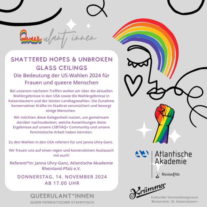 Unter dem Titel „Shattered hopes & unbroken glass ceilings – Die Bedeutung der US-Wahlen 2024 für Frauen* und queere Menschen“ referiert Janna Uhry-Ganz von der Atlantischen Akademie Rheinland-Pfalz e.V. zu den aktuellen Entwicklungen nach der Präsidentschaftswahl.