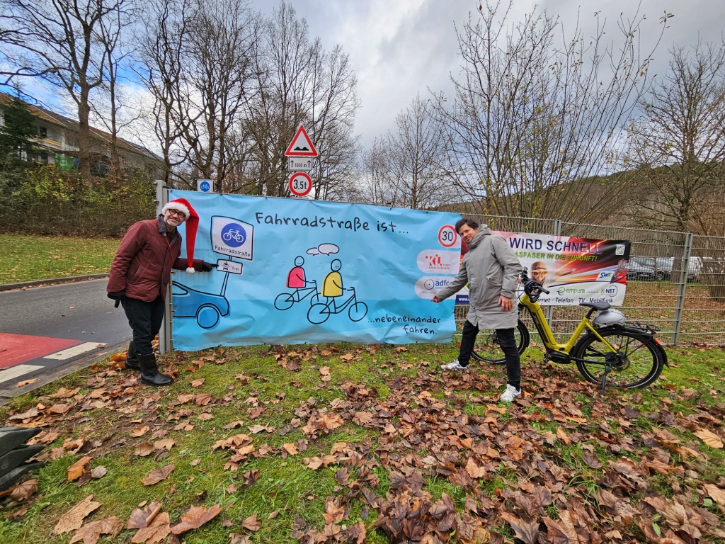 Nach eingehender Prüfung der Situation und Auswertung des umfangreichen Feedbacks sowie basierend auf einem Beschluss im Arbeitskreis Radverkehr versucht sich die Stadt nun an einem Kompromiss. Am Freitag wurden sechs der zwölf umstrittenen „Berliner Kissen“ – das sind künstliche Buckel, die Autos und größere Fahrzeuge zum Abbremsen und damit zum Einhalten des Tempolimits zwingen – wieder entfernt. Zu oft kam es Berichten zufolge durch stark und plötzlich abbremsende Fahrzeuge zu brenzligen Situationen gerade auch für beteiligte Radfahrer. Um alle Autofahrer an die Regeln der Fahrradstraße zu erinnern, wurden neue Banner aufgehängt. In dieser Woche kommen noch drei dauerhaft installierte Geschwindigkeitsanzeigen hinzu. Punktuell soll auch geblitzt werden, wie Baudezernent Manuel Steinbrenner am Freitag bei einem Vor-Ort-Termin mit Ortsvorsteher Thorsten Peermann erläuterte.