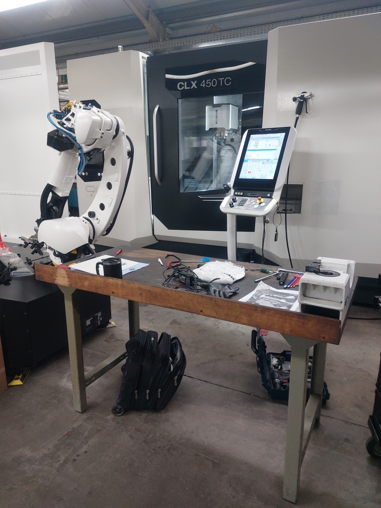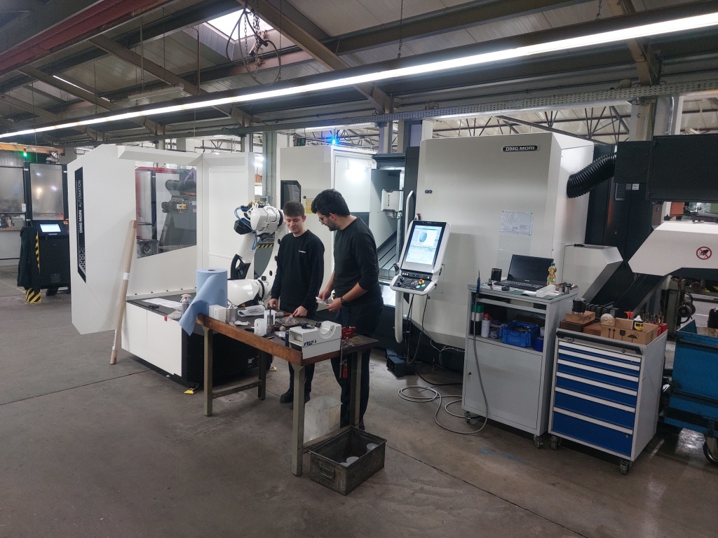 Heute wurde das neue Dreh-Fräszentrum der Firma DMG MORI in Betrieb genommen. Zusätzlich zur 6-Seiten-Komplettbearbeitung durch Haupt- und Gegenspindel ist eine vollständige Automation mit Hilfe der angeschlossenen Robotik möglich. „Wir wollen den Menschen sinnvoller einsetzen und ihm Raum schaffen, um komplexeren Tätigkeiten nachzugehen. Deshalb soll der Roboter simple Aufgaben übernehmen“, erklärt Geschäftsführer Michael Stridde. Vorerst wird sich Markus Scheuer, ebenfalls Geschäftsführer der Schäfer Drehteile GmbH, persönlich um das Einrichten und Programmieren der neuen Bearbeitungsmaschine kümmern.