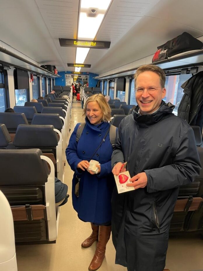 Mit einem Schokoladengruß haben sich Landesmobilitätsministerin Katrin Eder und der Direktor des Zweckverbandes ÖPNV Rheinland-Pfalz Süd, Michael Heilmann, heute Morgen bei den Kund:innen des Regional-Express Netzes für das Bahnfahren bedankt. Am und im Mainzer Hauptbahnhof fand der Auftakt für die gemeinsame Dankeschön-Aktion der Länder und Aufgabenträger des SÜWEX sowie der DB Regio statt. Am Dienstag, dem 17. und Mittwoch, dem 18. Dezember werden morgens bis zum späten Vormittag mehrere Teams in den SÜWEX-Zügen eine kleine Überraschung verteilen.