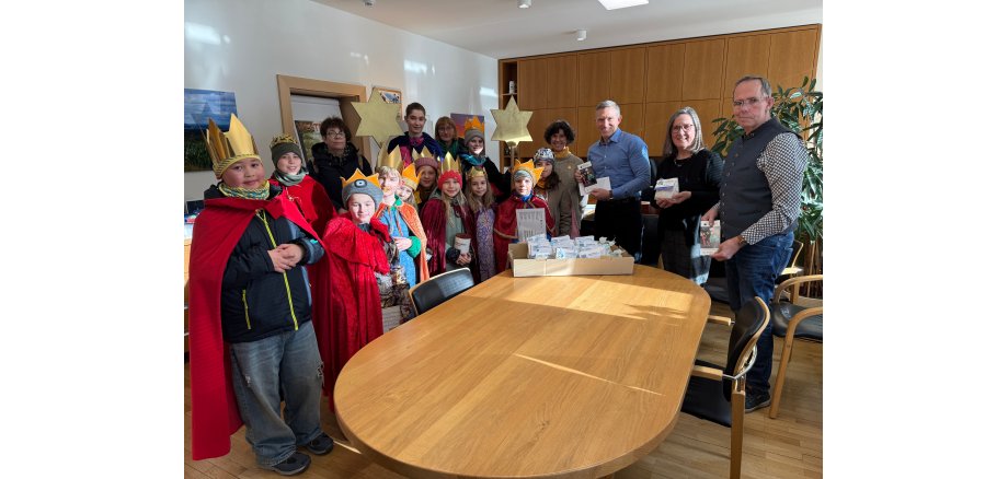 Traditionell besuchten am 7. Januar Sternsinger der Gemeinde St. Martin die Kreisverwaltung, um den Segen zu überbringen. Landrat Ralf Leßmeister begleitete die 12 Segensbringer bei ihren Liedern auf der Gitarre und der gesamte Kreisvorstand stimmte in den Gesang mit ein. Die Kinder der Pfarrei St. Martin sammeln für Projekte in ihren Partnergemeinden in Ruanda und Uruguay. Dafür überreichte Landrat Leßmeister eine Spende des Landkreises und bedankte sich mit kleinen Geschenken bei den Sternsingern für ihr Kommen.