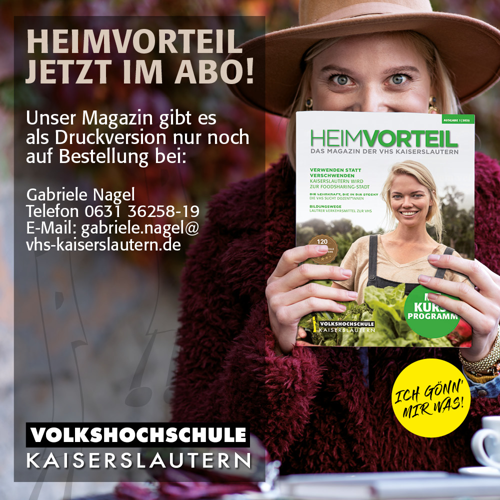 Doch die Zeiten haben sich verändert. Angesichts drängender Herausforderungen wie Nachhaltigkeit und Ressourcenschonung hat die VHS beschlossen, ihr Magazin HEIMVORTEIL mit Kursübersicht ab dem ersten Halbjahr 2025 nicht mehr flächendeckend zu verteilen. Stattdessen wird es weiterhin kostenlos an unsere treuen und neuen Abonnentinnen und Abonnenten verschickt und an vielen öffentlichen Stellen in der Stadt, wie Bibliotheken, Banken und Behörden ausgelegt. Natürlich können alle Ihr Exemplar auch direkt in der VHS abholen. Abonniert werden kann es kostenlos über Gabriele Nagel, 06313625819 oder per Email an gabriele.nagel@vhs-kaiserslautern.de oder die Geschäftsstelle der VHS.