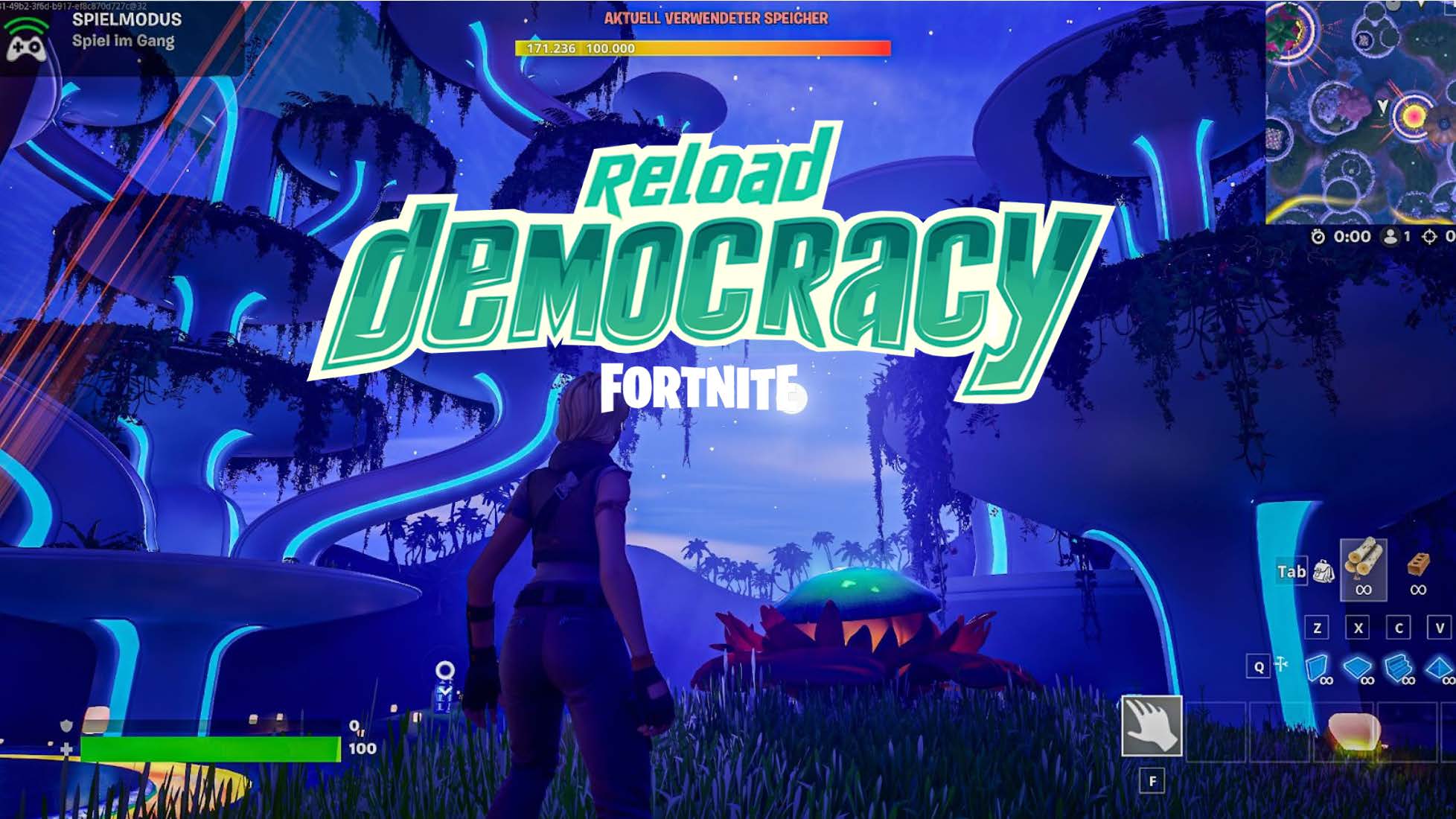 „Reload Democracy“ ist ein Festival der Demokratie, das in Fortnite stattfindet. Es feiert die Vielfalt unserer Gesellschaft und bietet jungen Menschen eine Bühne für Musik und Aktivismus. Junge Leute performen ihre Musik und zwischen den Auftritten finden interaktive Gespräche mit jungen Aktivisten statt, die ihre persönlichen Erfahrungen mit den anderen Spielerinnen und Spielern teilen.