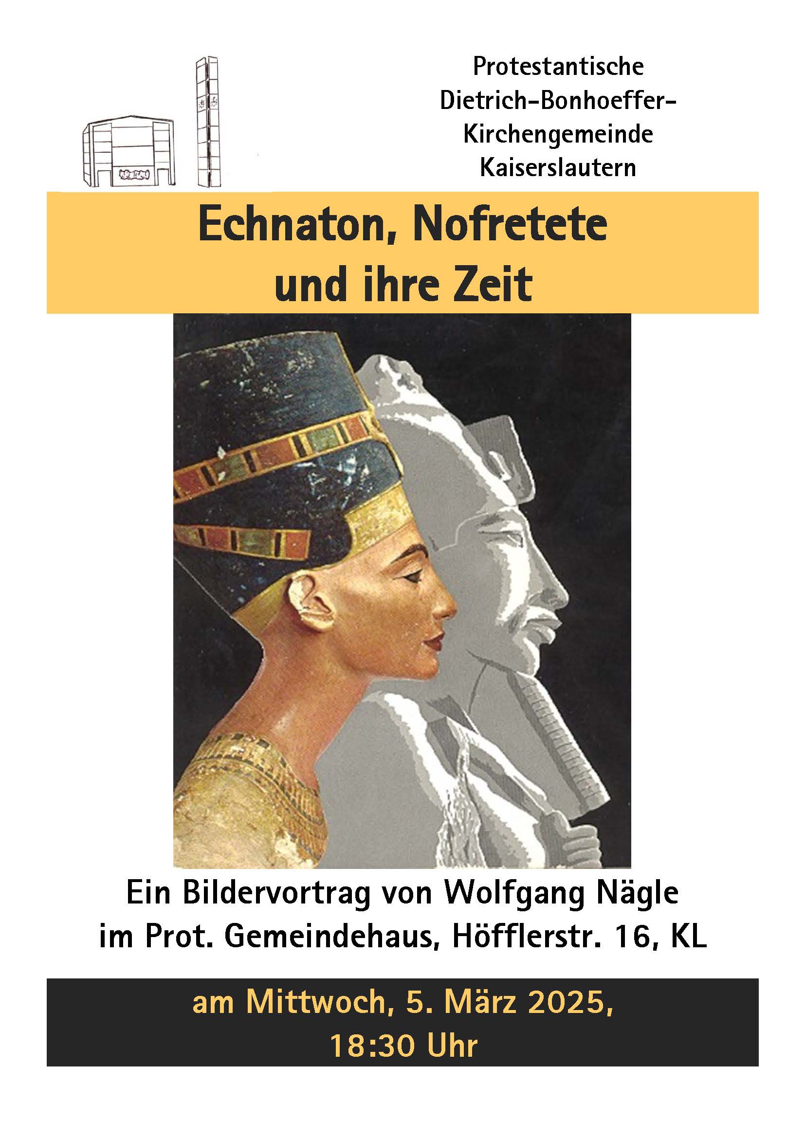 Wolfgang Nägle referiert am 5. März 2025 um 18:30 Uhr im Prot. Dietrich-Bonhoeffer-Gemeindehaus, Höfflerstraße 16, zu „Echnaton, Nofretete und ihre Zeit“. Der Eintritt ist frei.