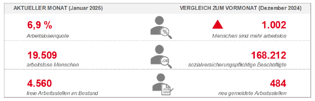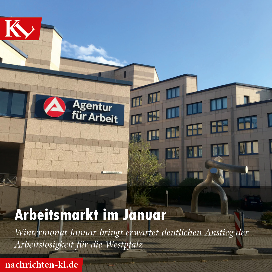 Die Arbeitslosigkeit ist im Bezirk der Agentur für Arbeit Kaiserslautern-Pirmasens (Stadt Kaiserslautern, Stadt Pirmasens, Stadt Zweibrücken, Landkreis Donnersbergkreis, Landkreis Kaiserslautern, Landkreis Kusel, Landkreis Südwestpfalz) im Januar 2025 gestiegen. 19.509 Menschen waren arbeitslos gemeldet, 1.002 Personen mehr (5 Prozent) als im Dezember und 1.602 Personen bzw. 9 Prozent mehr als vor einem Jahr. Die Arbeitslosenquote betrug 6,9 Prozent und lag mit 0,3 Prozent über dem Vormonatsniveau. Vor einem Jahr lag sie bei 6,4 Prozent.