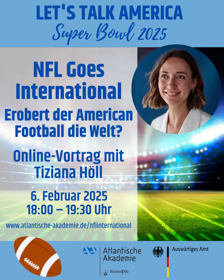 Am 6. Februar um 18 Uhr bietet die Atlantische Akademie Rheinland-Pfalz e.V. anlässlich des Super Bowls 2025 einen Online-Vortrag zum Thema NFL Goes International – erobert der American Football die Welt? online via ClickMeeting an. Referieren wird die Sportjournalistin und Podcasterin Tiziana Höll. Die Veranstaltung findet mit freundlicher Unterstützung des Auswärtigen Amts statt.