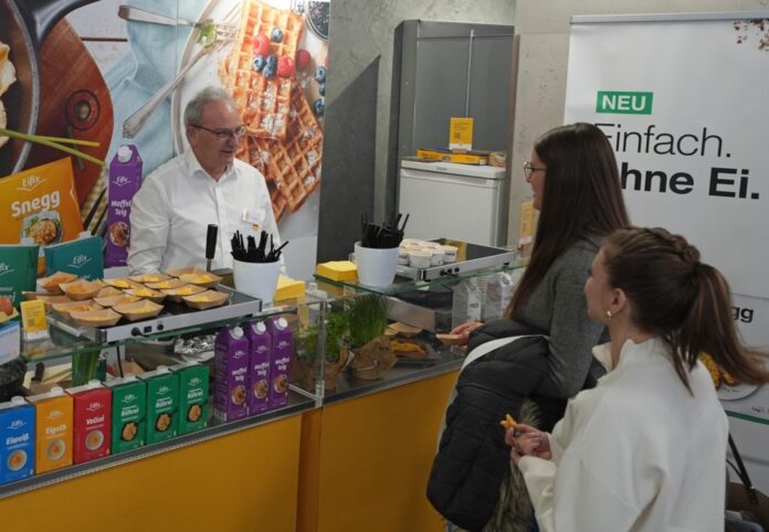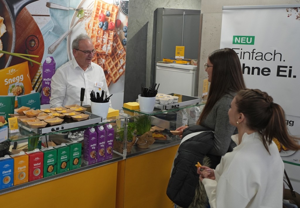 Neben vielfältigen Produkten aus Hühnereiern gehören mittlerweile auch pflanzenbasierte Ei-Alternativen zum Angebot von EIPRO aus dem niedersächsischen Lohne. Ergänzend zur Produktinformation auch ein Tasting anzubieten, hält Gebietsverkaufsleiter Christian Jansa für ganz entscheidend. Über großen Anklang berichtete er von der Linie pasteurisierter Eier: „Durch die schonende Wärmebehandlung in der Schale bleiben unsere Eier natürlich und zugleich lebensmittelsicher.“
