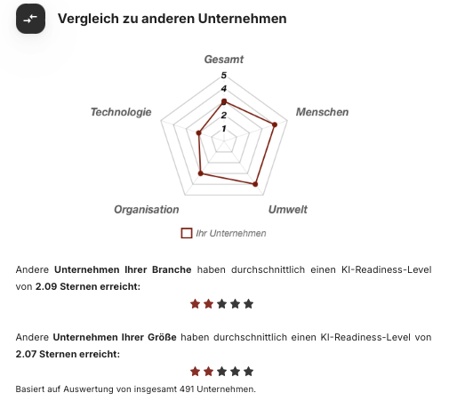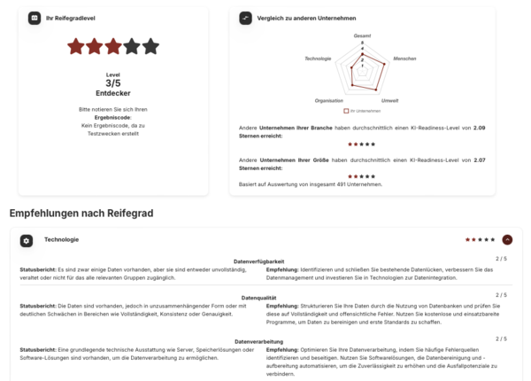 Zunächst einmal ist KIRC ab sofort kompakter & fokussierter: Mit 40 Fragen in den Kategorien Technologie, Organisation, Umwelt und Menschen ist der Check nun fast 50 % kürzer als zuvor. Darüber hinaus können Unternehmen nun die neue Funktion „Vergleiche“ nutzen, mit der KMU ihre Ergebnisse direkt mit Unternehmen ähnlicher Größe und Branche vergleichen können. Und schließlich ist auch die Ergebnisseite nun noch detaillierter und alle Ergebnisse sind mit dem den individuellen Code jederzeit abrufbar. Natürlich können auch ältere Ergebnisse mit dem personalisierten Code nach wie vor abgerufen werden.