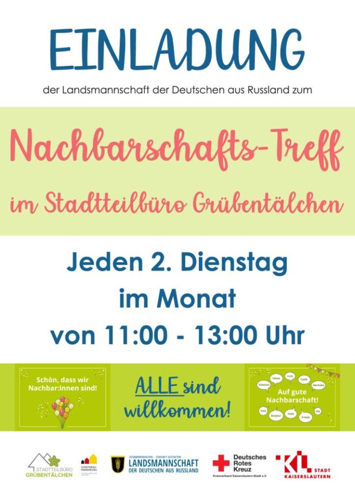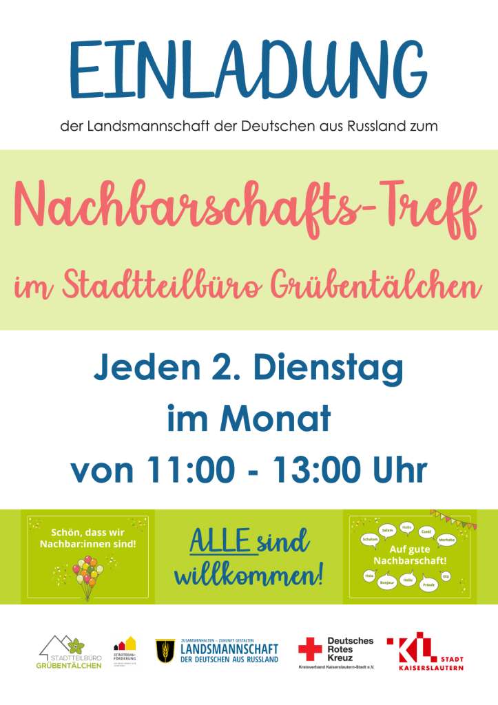 Die Landsmannschaft der Deutschen aus Rußland lädt zum monatlichen Nachbarschaftstreff an jedem 2. Dienstag / Monat von 11:00 – 13:00 Uhr ins Stadtteilbüro Grübentälchen, Friedenstr. 118, ein. Alle sind herzlich willkommen! Nächster Termin ist Dienstag, der 11. März.