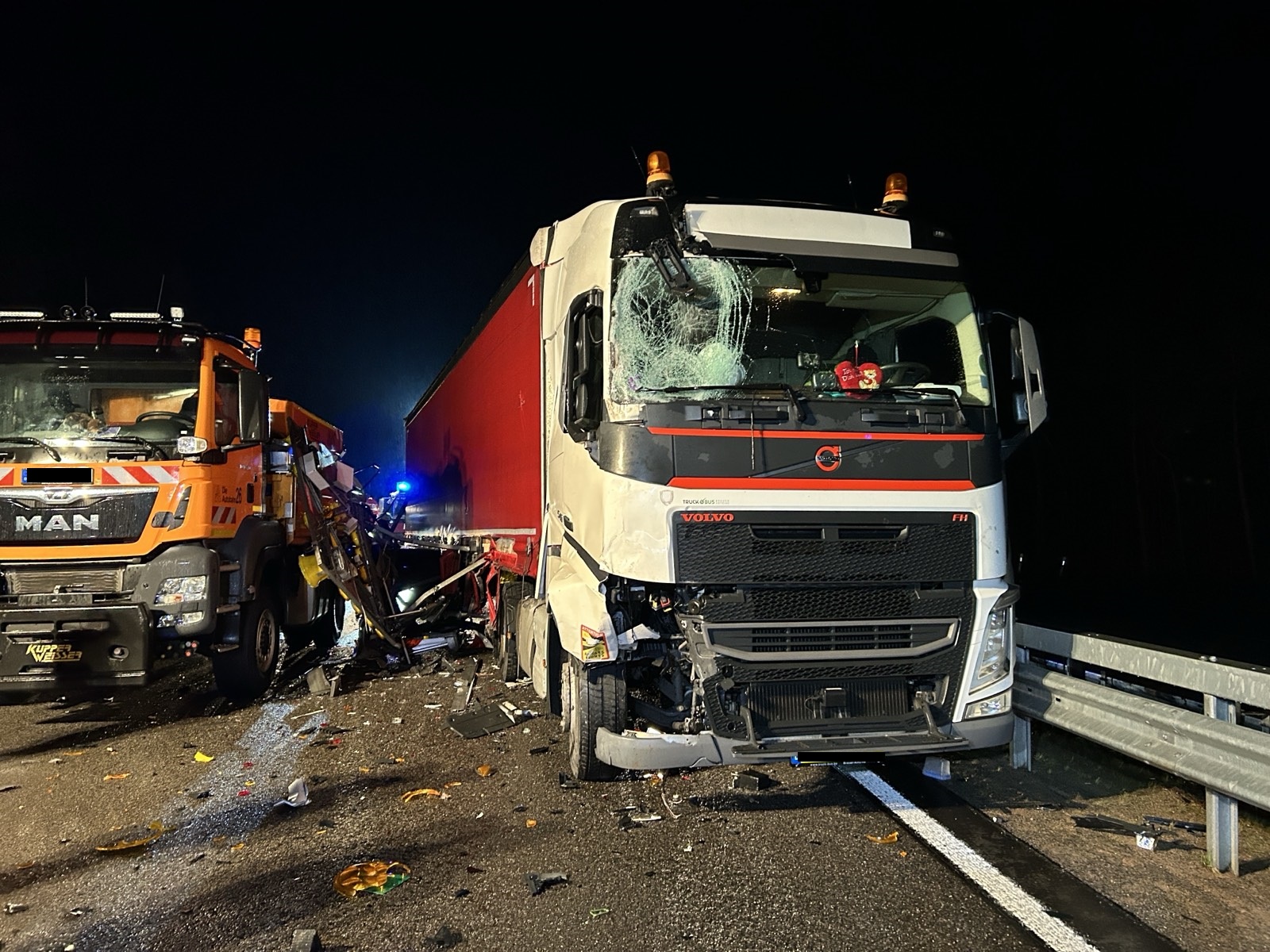 Am gestrigen Nachmittag kam es auf der BAB 6 in Richtung Saarbrücken, zwischen den Anschlussstellen Enkenbach und Kaiserslautern-Ost zu einem Brand eines Sattelzuges. Ursächlich dürfte ein geplatzter Reifen an der Sattelzugmaschine gewesen sein. Nachdem der 36-jährige Fahrer geistesgegenwärtig seinen Sattelzug auf dem Standstreifen zum Stehen brachte, hatte die Zugmaschine bereits Feuer gefangen. Der Brand dehnte sich direkt auf den Sattelauflieger aus. Der Fahrer konnte sich jedoch unverletzt aus dem brennenden Fahrerhaus retten. Die verständigte Feuerwehr brauchte über eine Stunde,um den im Vollbrand stehenden Sattelug zu löschen. Für die Dauer der Lösch- und Bergungsmaßnahmen, war die Richtungsfahrbahn Saarbrücken voll gesprerrt. Die Bergung des total zerstörten Sattelzuges stellte sich allerdings schwieriger heraus, als anfangs angenommen und zog sich bis weit nach Mitternacht. Im Rahmen der Bergungsmaßnahmen kam es zeitweise zu einem 8 km langen Rückstau. Der Verkehr wurde an der Anschlussstelle Enkenbach abgeleitet. Infolgedessen ereignete sich ein weiterer schwerer Unfall. Ein 49-jähriger LKW Fahrer übersah anscheinend das Stauende und fuhr in ein Absicherungsfahrzeug der Autobahnmeisterei. Zum Glück war dieses nicht besetzt, so dass es hierbei nur bei erheblichen Sachschäden blieb. Der Unfallverursacher blieb ebenfalls unverletzt. Durch diesen weiteren Unfall verzögerte sich wiederum die weiteren Bergungsmaßnahmen, so dass erst am frühen Dienstagmorgen die Richtungsfahrbahn Saarbrücken für den Verkehr endgültig wieder freigegeben werden konnte. Der Sachschaden bei beiden Unfällen dürfte sich auf mindestens 250.000 Euro belaufen.