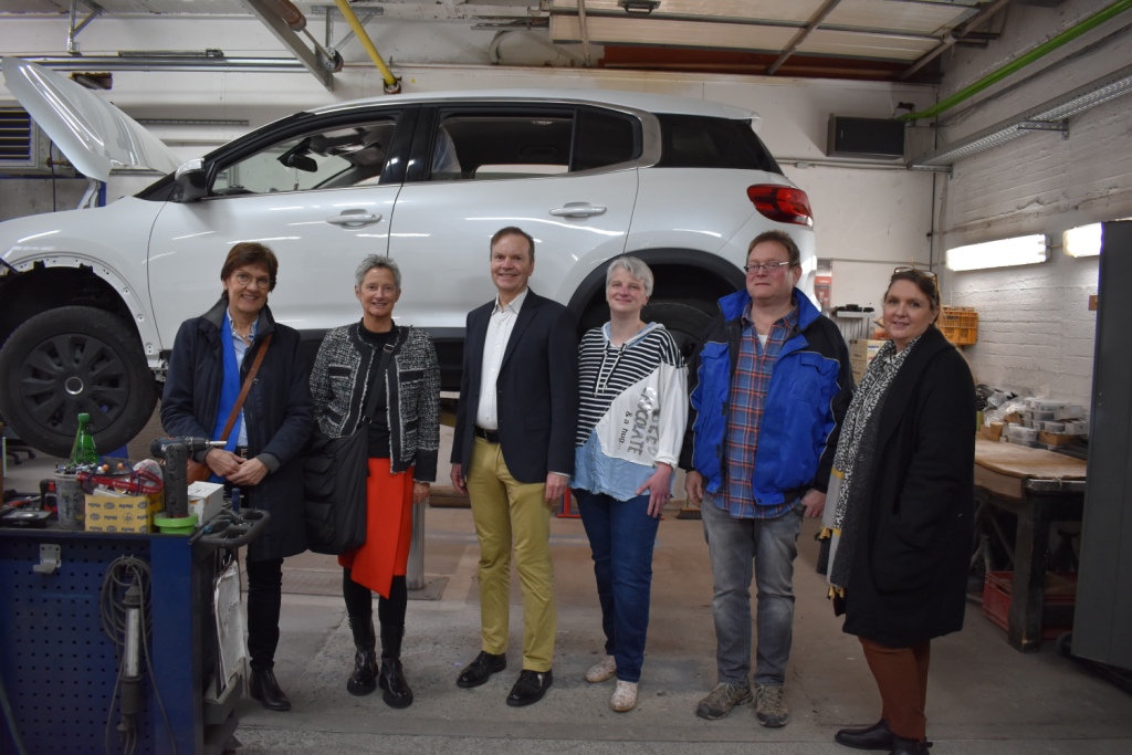 Oberbürgermeisterin Beate Kimmel und Philip Pongratz, Geschäftsführer der Wirtschaftsförderungsgesellschaft Stadt und Landkreis Kaiserslautern mbH (WFK), haben am Dienstag, 25. Februar 2025, die Werkstatt der Lackier- & Karosseriezentrum Schäfer GmbH in Kaiserslautern besucht. Mit dabei waren auch Rita Petry, Geschäftsführerin der Handwerkskammer der Pfalz (HWK) und Leiterin des Geschäftsbereichs Berufsbildung, und Veronika Pommer, Regionalleiterin Nordwestpfalz der Industrie- und Handelskammer für die Pfalz (IHK).