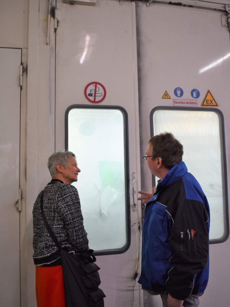 BU 2: Michael Schäfer erklärt Oberbürgermeisterin Beate Kimmel die in der Lackiererei eingesetzte Technologie.