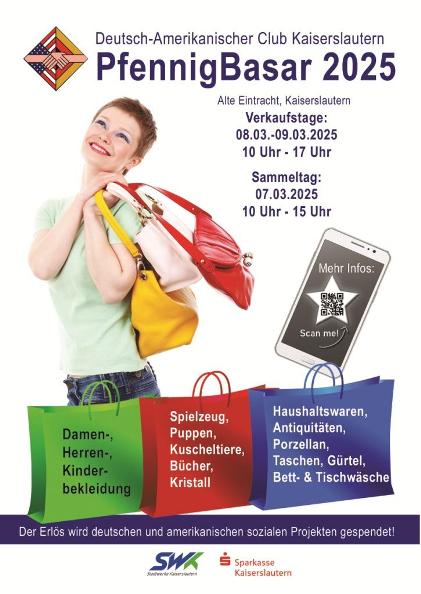 „Wow! Sowas habe ich schon immer gesucht!“ Beim Pfennigbasar wird einfach jeder fündig. Von Fashion, besonderen Antiquitäten, Raritäten bis Bestseller. Der Pfennigbasar des Deutsch-Amerikanischen Clubs Kaiserslautern ist ein echtes Highlight für Jung und Alt. Hier kommen nicht nur Shopping-Queens auf ihre Kosten, sondern auch wer gerne mal stöbern oder auf Schatzsuche geht.