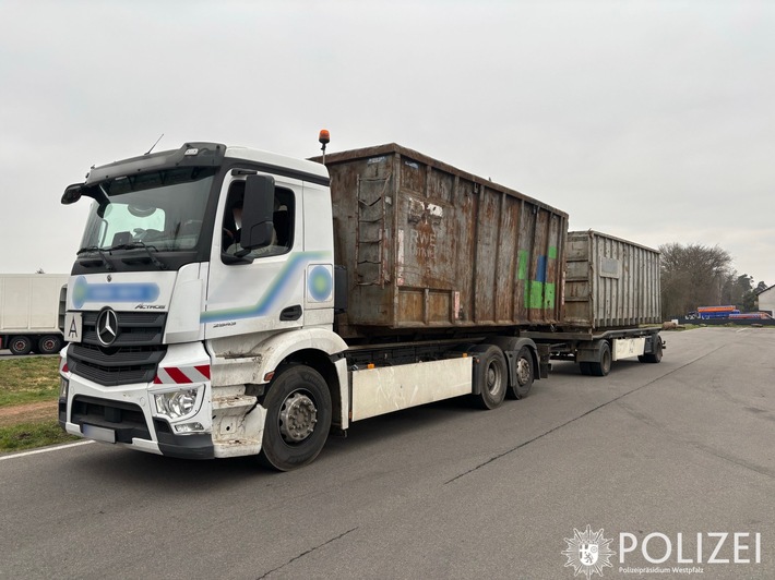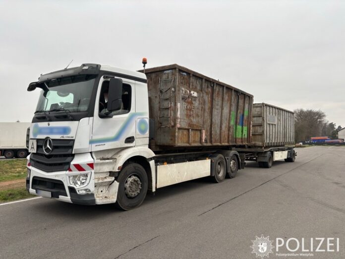 Die Liste ist lang: Bei dem Zugfahrzeug waren die Hauptuntersuchung und die Tachoprüfung abgelaufen. Der aufliegende Container war mit Schrott beladen. Hier waren aber drei von vier Verriegelungen defekt, weswegen das Herausfallen der Ladung unmittelbar bevorstand. Zudem war der Container wesentlich breiter als erlaubt. Bei dem Anhänger sah es nicht viel besser aus: Die Bremsschläuche waren falsch montiert und waren kurz davor, sich von den Schlauchverbindungen zu lösen. Ebenso waren die Bremszylinder der zweiten Achse falsch zusammengebaut. Die Reifen des Hängers waren an der Innenseite stark beschädigt. Aufgrund des desolaten Zustands des Fahrzeugs wurde eine Weiterfahrt durch die Beamten untersagt. Erst nachdem alle Schäden behoben sind, darf der Lkw wieder auf die Straße. Den Fahrzeugschein stellten die Ordnungshüter sicher. Die Ermittlungen gegen den Fahrer sowie gegen den Halter des Lasters dauern an. Der Brummifahrer muss sich darüber hinaus auch noch gesondert äußern, da er bei der Kontrolle keine Berufskraftfahrerqualifikation vorweisen konnte. |kfa