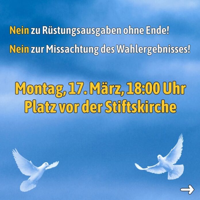 „Die angehende Koalition versucht in einem unglaublichen Coup das Grundgesetz kurzfristig zu ändern, um Hunderte Milliarden Euro Schulden für Aufrüstung aufnehmen zu können,“ kritisieren die Veranstalter das Vorhaben.