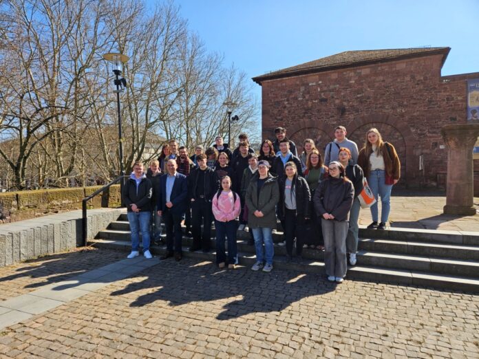 Die Gruppe besteht aus elf angehenden Tischlerinnen und Tischlern sowie zwei Betreuerinnen. Im Pfalzgrafensaal waren sie gemeinsam mit ihren deutschen Partnerschülerinnen und –schülern zu Gast, von wo aus es auf eine Stadtführung zum Kennenlernen der Barbarossastadt ging. Bürgermeister Schulz wünschte eine spannende Zeit in Kaiserslautern. „Unsere Partnerschaft mit Saint-Quentin besteht seit fast 60 Jahren und wird aktiv gelebt. Viele Projekte und Begegnungen haben sie über die Jahrzehnte geprägt – so wie heute auch Sie. Mit Ihrem Austausch tragen Sie dazu bei, diese Freundschaft weiter zu pflegen“, bedankte er sich für den Mut, sich auf das Abenteuer eines dreiwöchigen Auslandsaufenthalts einzulassen. „Solche Erfahrungen prägen und schaffen Verbindungen, die oft ein Leben lang in Erinnerung bleiben.“