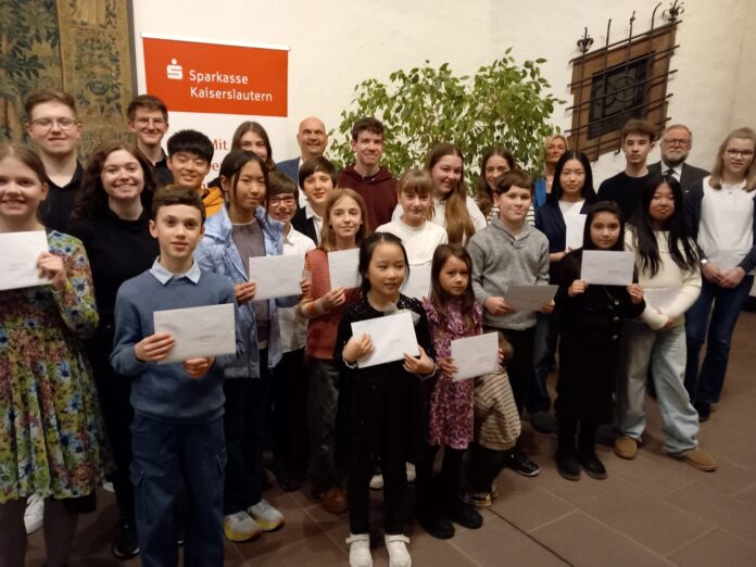 Insgesamt 18 Teilnehmende mit einem ersten Preis, davon neun mit einer Weiterleitung zum Landeswettbewerb, sowie weitere 14 Teilnehmende mit einem zweiten Preis – so lautet das beeindruckende Ergebnis, das sich die insgesamt 32 jungen Musikerinnen und Musiker aus dem Stadtgebiet beim diesjährigen Regionalwettbewerb „Jugend musiziert“ erspielt haben. Bei einer Feierstunde im Pfalzgrafensaal des Casimirschlosses gratulierte Bürgermeister und Kulturdezernent Manfred Schulz dem musikalischen Nachwuchs aus der Stadt Kaiserslautern. „Ihr habt hohes musikalisches Können bewiesen und eine Superleistung erbracht, auf die Ihr zu Recht stolz sein dürft“, lobte er das gute Abschneiden der jungen Teilnehmerinnen und Teilnehmer. Zusammen mit dem stellvertretenden Vorstandsmitglied der Sparkasse, Patrick Wagner, und deren Marketingleiterin Andrea Brunnett überreichte er anschließend die von der Sparkasse Kaiserslautern gestifteten Preise im Gesamtwert von über 1.300 Euro.