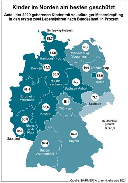Die Ständige Impfkommission (STIKO) am Robert-Koch-Institut empfiehlt die Masernimpfung in den ersten zwei Lebensjahren. Laut Arzneimittelreport ist der Anteil der Kinder aus Rheinland-Pfalz, der in den ersten zwei Lebensjahren überhaupt nicht gegen Masern geimpft wurde, von 8,7 Prozent im Jahr 2018 auf 4,9 Prozent im Jahr 2022 gesunken. Zugleich ist der Anteil der Zweijährigen aus dem Bundesland, der beide Masern-Impfdosen erhalten hat, von 79,3 Prozent auf 88,6 Prozent gestiegen. „Dank der Masernimpfpflicht zeigt der Trend bei den Masernimpfungen in Rheinland-Pfalz in die richtige Richtung, allerdings sind die Impflücken noch zu groß. Je größer die Impflücken in einzelnen Regionen ausfallen, desto mehr steigt dort das Risiko für Masernausbrüche“, erläutert Kleis. Nach wie vor seien zu viele Kinder nicht ausreichend gegen die hochinfektiösen Masern geschützt.