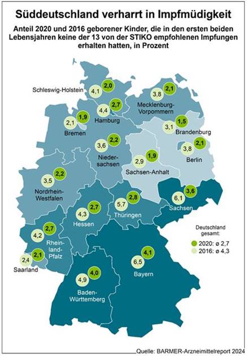 Der Arzneimittelreport liefert auch Daten zu den anderen Impfungen, deren Verabreichung die STIKO vor dem zweiten Geburtstag empfiehlt. So lagen im Jahr 2022 bei zweijährigen Kindern aus Rheinland-Pfalz die Quoten bei den Impfungen ohne Impfpflicht wie Keuchhusten, Kinderlähmung und Wundstarrkrampf zwischen 72,6 und 88,6 Prozent. Alle 13 von der STIKO in den ersten zwei Lebensjahren empfohlenen Impfungen hatte nur rund jedes zweite rheinland-pfälzische Kind (54,6 Prozent) erhalten. Nicht eine dieser Impfungen hatten im gleichen Jahr 2,7 Prozent der zweijährigen Kinder in dem Bundesland verabreicht bekommen. „Der größte Feind der Impfungen ist ihr eigener Erfolg. Bei hohen Durchimpfungsraten sind Erkrankungen wie Masern kaum noch sichtbar, sodass Impfungen nicht als wichtige Schutzmaßnahme erkannt werden“, sagt Kleis. Das Bewusstsein für den Schweregrad der Erkrankungen gehe verloren.